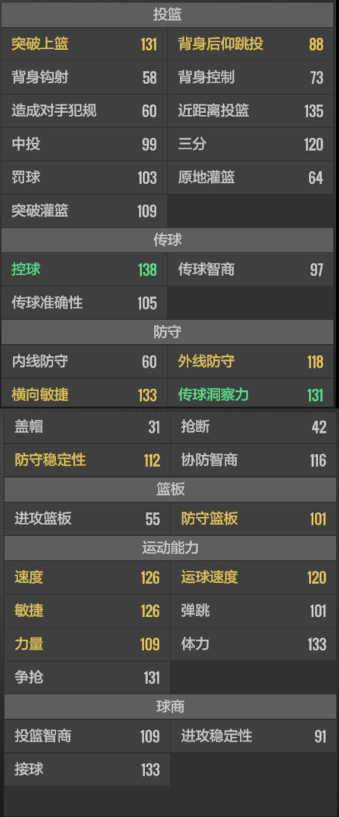 而史蒂芬森的131的突破上篮加上【闪躲终结者】与【特技演员】,篮下终结也非常稳定!