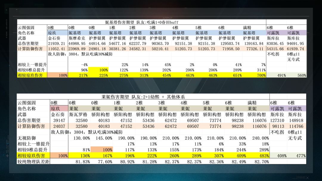 4椎:增加15%的局内攻击力加成,并且将额外稳态伤害从3点提升到6点。总伤害提升约为11%。这里有一个小细节,局内攻击力是目前少前2最高贵的buff,因为它不仅直接和角色总攻击力乘算,还可以提升穿防率。但是由于物理队的穿防乘区已经是最大值了,所以攻击力buff的收益反而被稀释了。