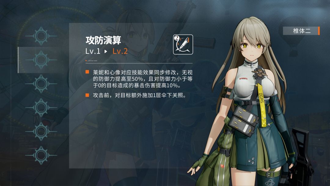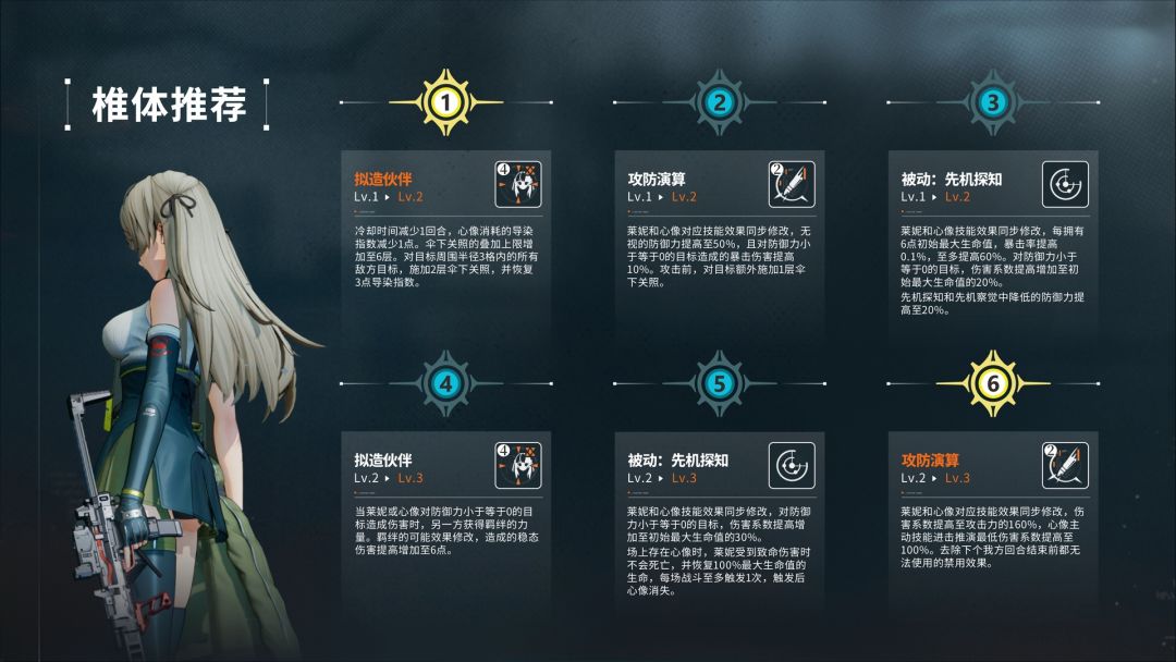 1椎:加快【伞下关照】buff的叠加速度,以及3层的叠加上限。心像的导染消耗 -1以及额外提供的3点导染都是为了推图而准备的,0+0虽然boss战不会有循环问题,但是在推图情况下经常会缺导染导致心像消失。如果是想用莱妮超大的技能范围推图的话,1椎是必不可少的。总伤害提升约为14%。