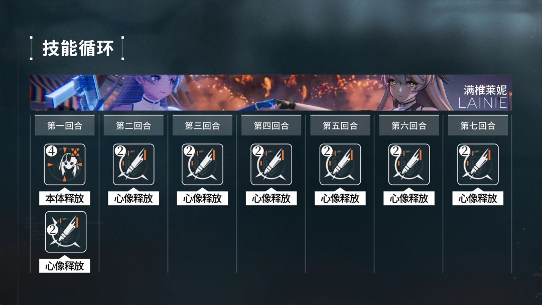 那么接下来就到了角色的技能循环。莱妮的技能循环也是非常的简单呀,6椎以下,采用本体开局大招加心像2技能,之后心像3技能和2技能循环释放就可以了。6椎唯一的变化就是不释放3技能,只释放2技能就可以啦,这是对单情况。如果是对付群怪,推荐先移动心像调整技能范围,再用本体释放技能。