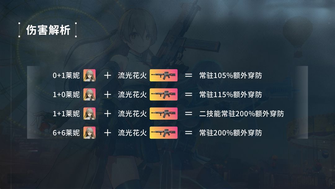 2椎:继续加快【伞下关照】的叠层速度,从2回合叠满变成1回合叠满。并且增加了二技能的20%无视防御以及10%爆伤,在1+1莱妮搭配幼熙专武的情况下,二技能可以刚好达到200%的无视防御效果。总伤害提升约为13%