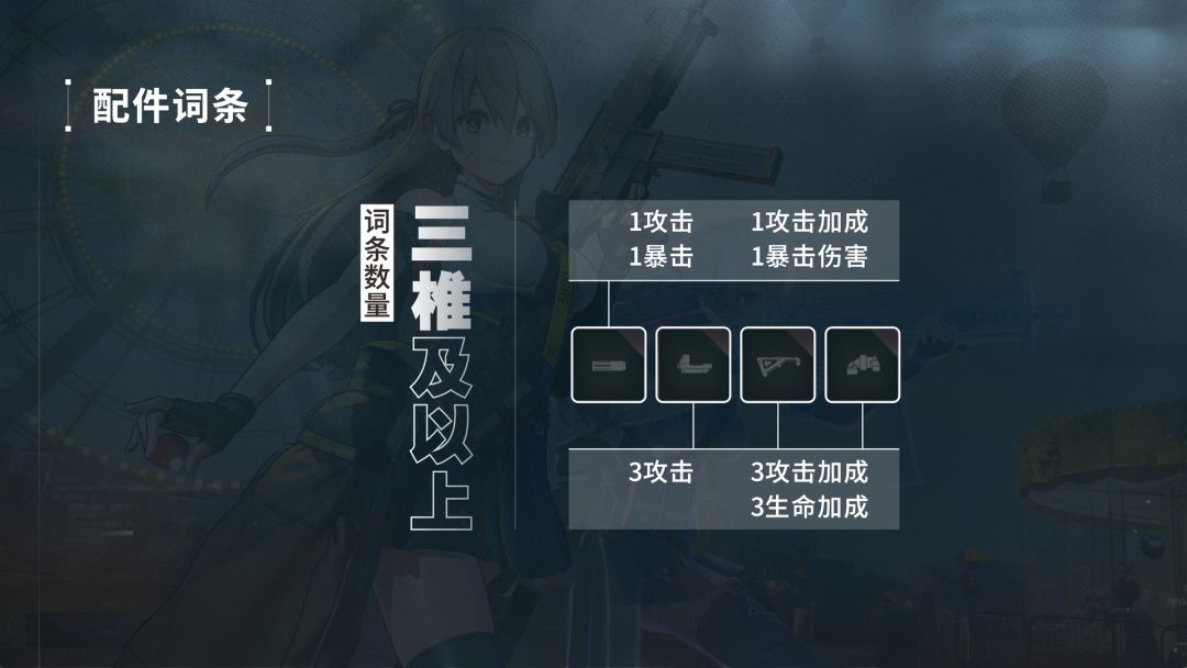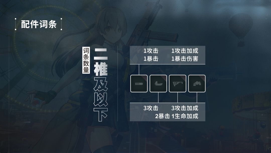 除此以外,莱妮的武器配件词条,也和其他角色也有所不同。携带1爆伤、4大攻击和4小攻击,剩下的词条如果是二椎及以下使用3暴击+1大生命;