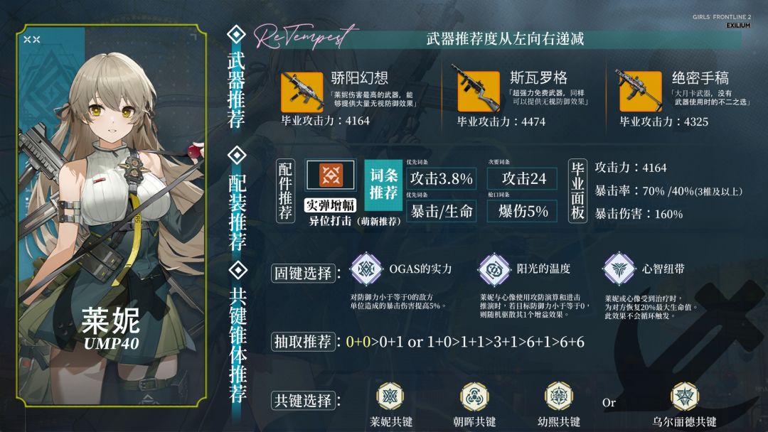 接下来就是养成方面了,首先就是武器配件。由于物理队没有任何人可以施加【异位Debuff】,所以如果打算玩纯物理队,只能选择实弹增幅。那么有的兄弟可能就会问了,牢R,我都已经刷出满练的异位打击了,有没有什么可以让物理队用异位打击的方法吗?有的,兄弟,有的,方法一:牺牲掉一部分物理队的输出,与其他属性组队,例如现在的物理毒队就是不错的选择。在这种情况下,莱妮会损失掉约18%的输出。方法二:不戴越键的索米或者琼玖提供的【雪崩】和【溢火】debuff都是算作异位debuff而不造成异位伤害的,把她们的其中一个塞入物理队,就可以触发异位打击啦。