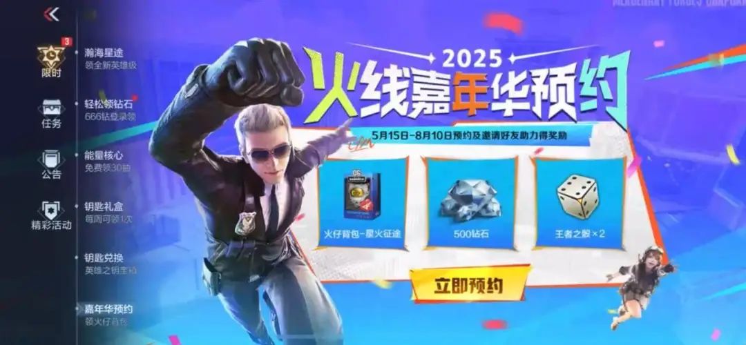 火线嘉年华,不仅是线上CFer们的狂欢,也是线下CFer的聚会盛典。今年8月2日即将迎来火线嘉年华, 现在参与预约活动就能一键领取火仔背包、钻石、王者之骰等奖励,邀请好友助力还可以领取M200-神秘黑洞等超多奖励,本期就给大家爆料2025嘉年华预约活动!