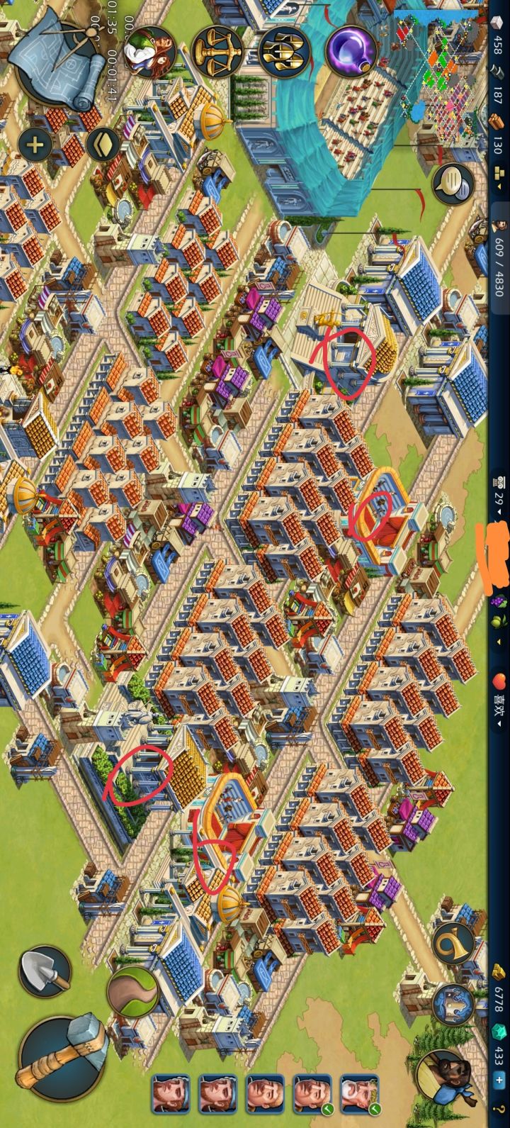 剧院,议会厅,中级神殿,都可以搬走给另外的居民区用,这样就会有一些空间 用地不会太紧张,只留下商店用来收税。