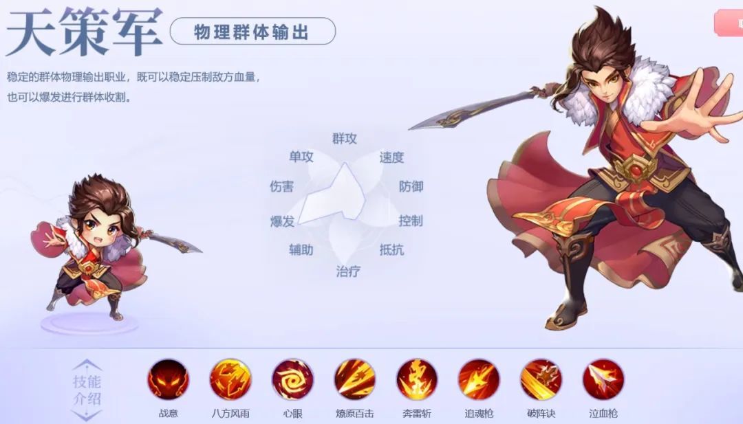 天策军是物理面伤的王者,但当前版本并不热门,因为大家更倾向于逐个击破。天策军需更强硬件支撑才能发挥优势。核心技能燎原百击在心眼加持下伤害很高,但点杀能力不足。