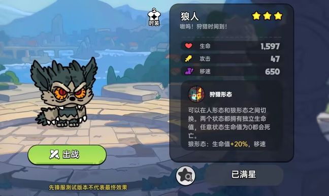 狼人可以作为PVP角色,同时狼人变为狼形态可以作为跑图角色使用,独立生命值的特点,可以给狼人更多的容错更多的生存空间。