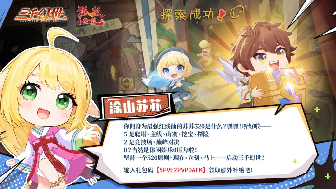 📐敲黑板!划重点啦~我们要坚持一个520原则,现在、立刻、马上——启动三千幻世!输入【5PVE2PVP0AFK】领取额外补给吧!