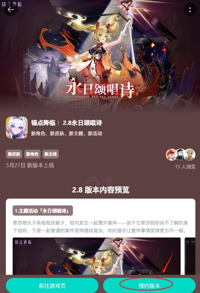 方式2:在TapTap中搜索“锚点降临”,点击下方的图片即可进入“预约新版本”界面。