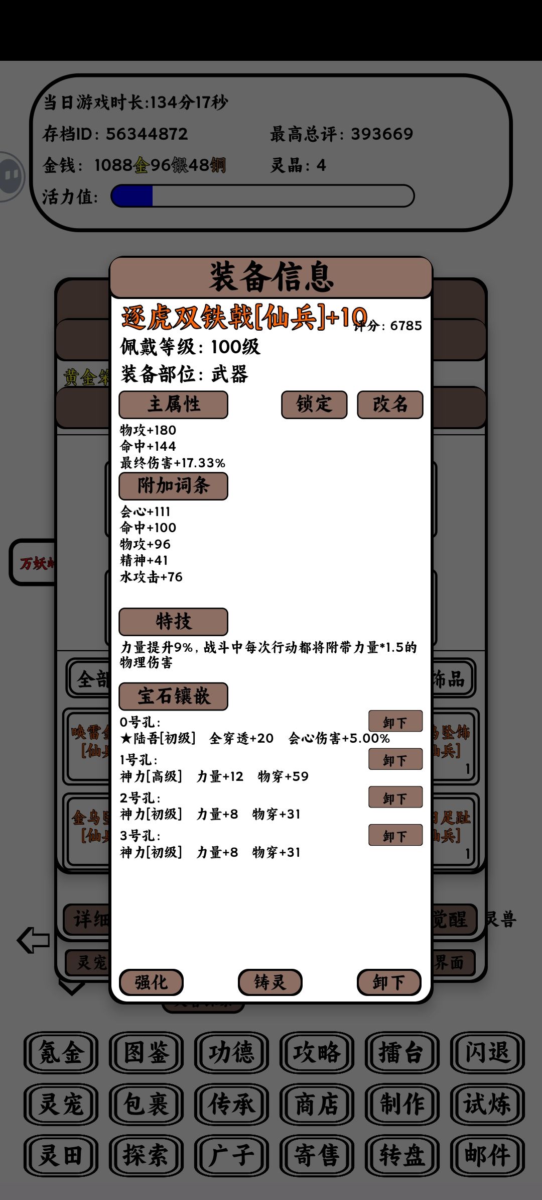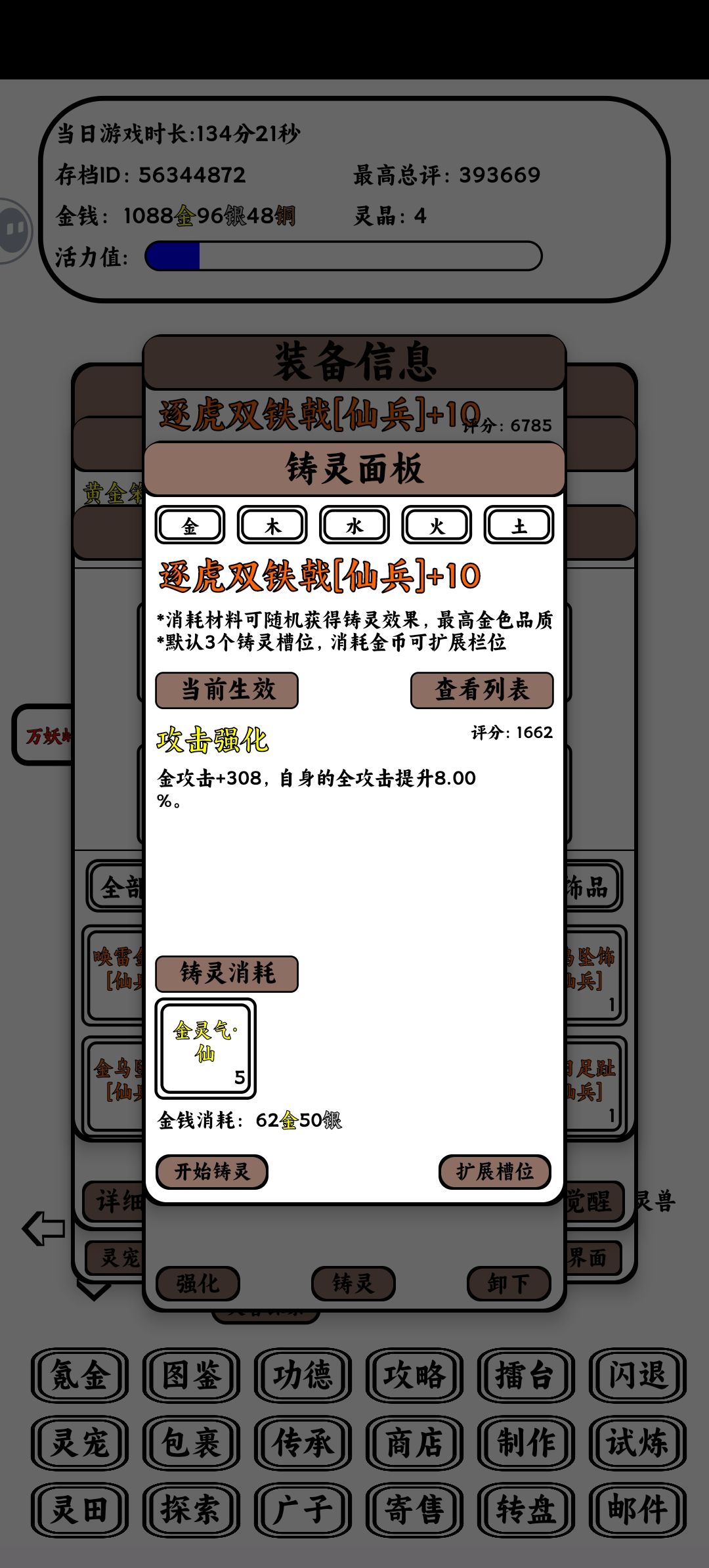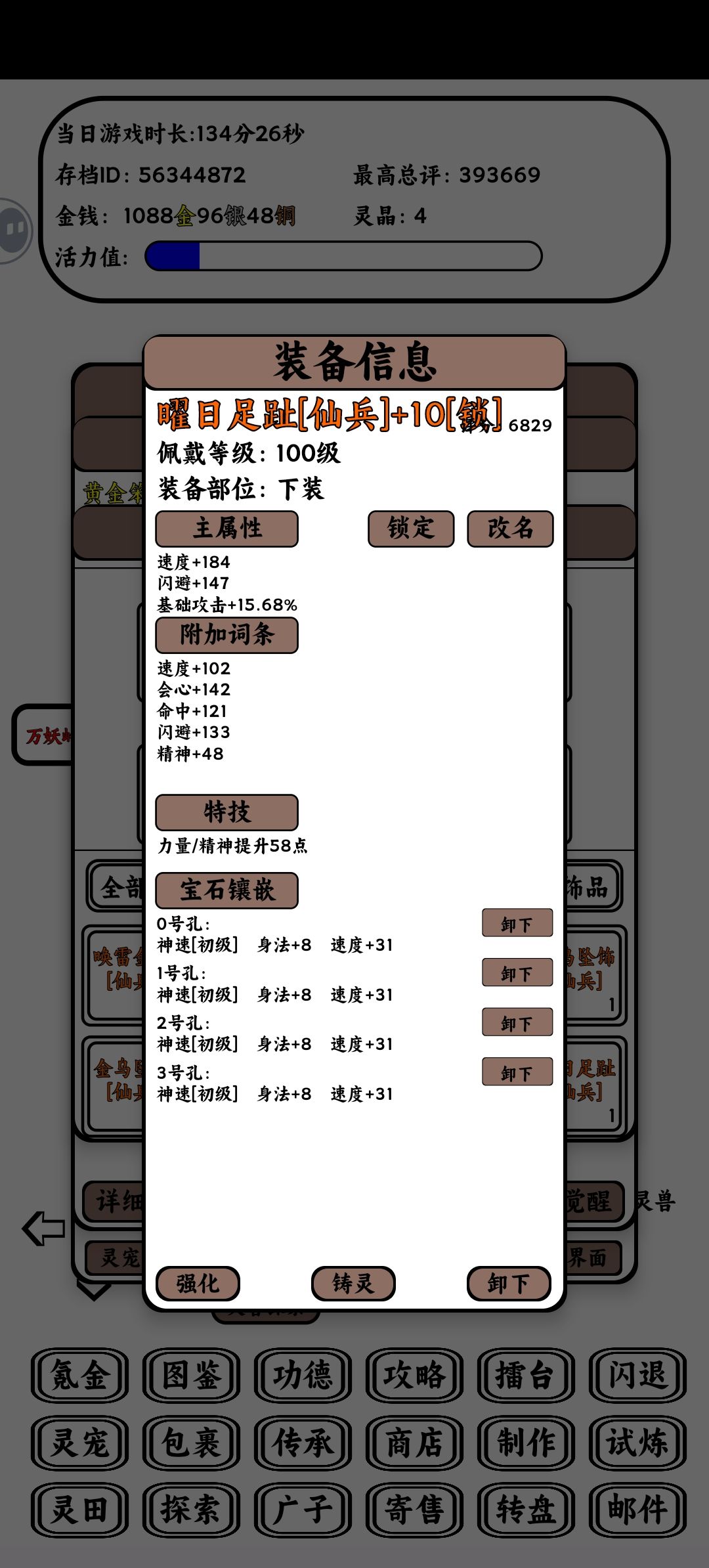 最后说说装备属性选择,优先力量,精神,身法等五维多的装备,其次命中,会心,双穿,双攻。