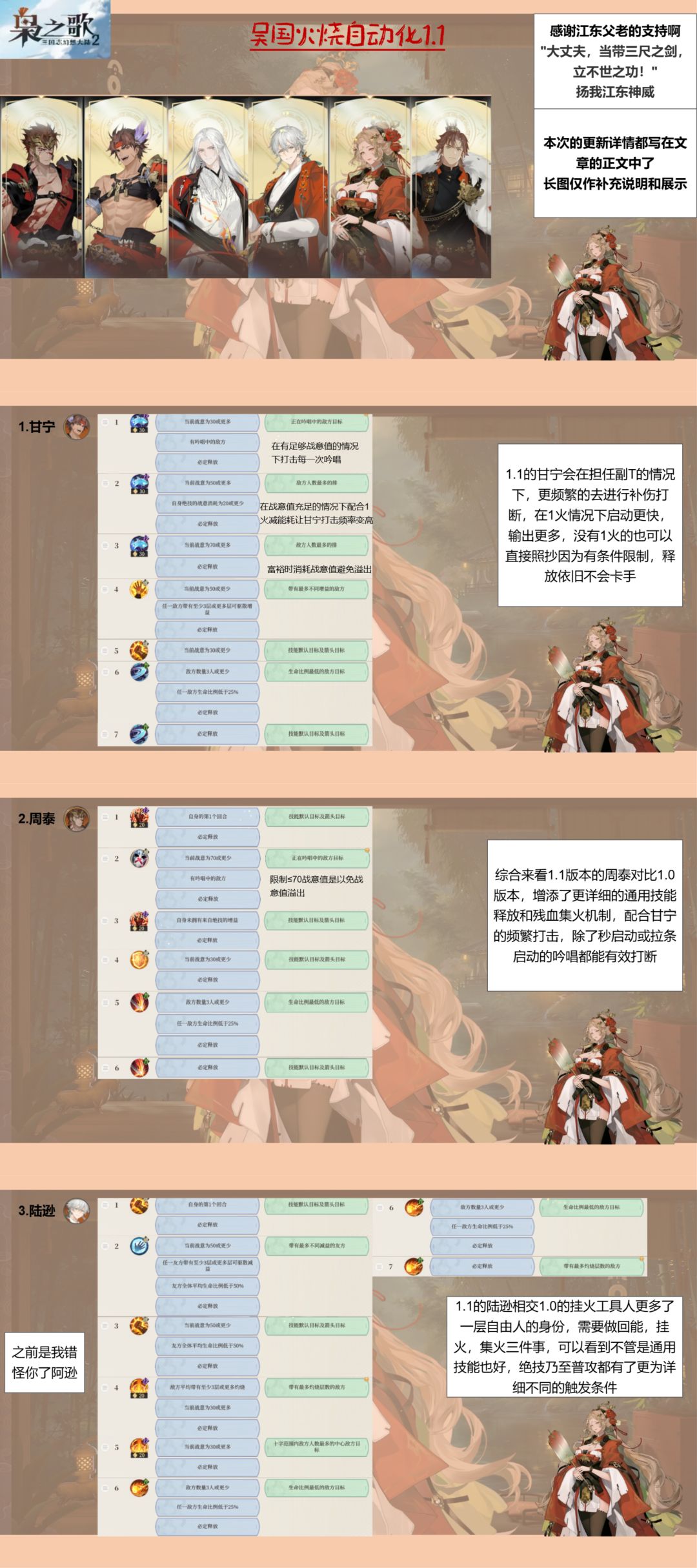 7.为孙权添加了血线压力大时的紧急方案:在孙权自身生命值≤50%,任一友方生命≤25%,友方全体生命值≤25%这三种情况时,孙权会将”吴王令“给到步练师,让步练师拉条上来进行抬血。以上就是关于火烧1.1的更新内容了,后续的更新依然在继续(由于本人还未拥有曹仁,所以曹仁的替换计划还得延后,对此十分抱歉)