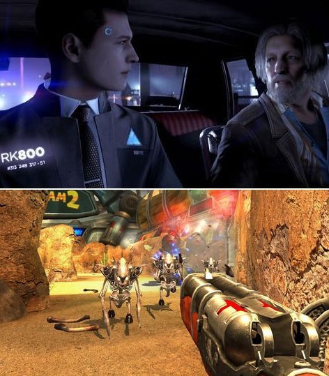 《底特律:变人》(上)和《英雄萨姆》(下)代表了对剧情的两种态度
