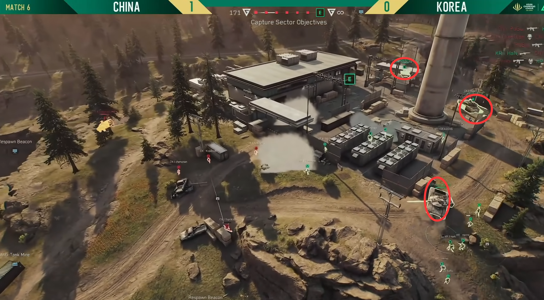 如果你当时正在看比赛的直播,那么当中国队到了E点之后,观众才发现韩国队的套路是什么。那句是前面选择战略放弃,然后积累积分,同时通过偷袭载具消耗中国队的积分储备。这个套路的最后一环是韩国队在E点防守阶段攒了三两坦克,进可以集火中国队的载具,退可以快速在点内清理占点的步兵。