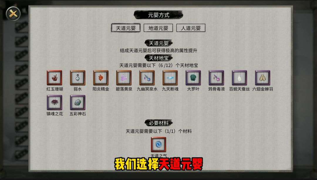 突破元婴我们选择【天道元婴】材料选择:红玉珊瑚+弱水+阳炎精金+碧落黄泉+镇魂之花