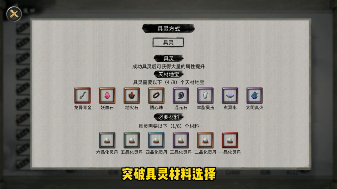 突破具灵材料选择:龙骨青金+妖血石+悟心珠+太阴真火