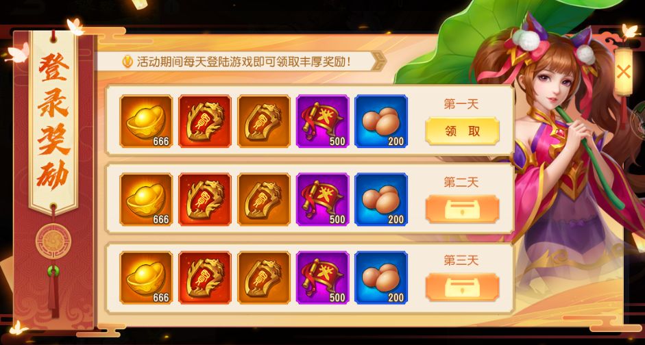 活动期间,主公每日登录即可领取功绩*500、土鸡蛋*200、元宝*666、择贤令*1和择贤举善令*1。