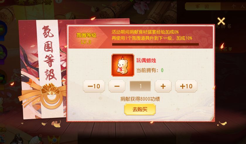 氛围道具助力主公盛宴等级再上一层楼,主公捐献[玩偶蜡烛]可以提升氛围等级,捐献鲜制奶油、土鸡蛋即可获得经验加成,最高可达50%!10级不是梦,快和小伙伴一起参与吧。