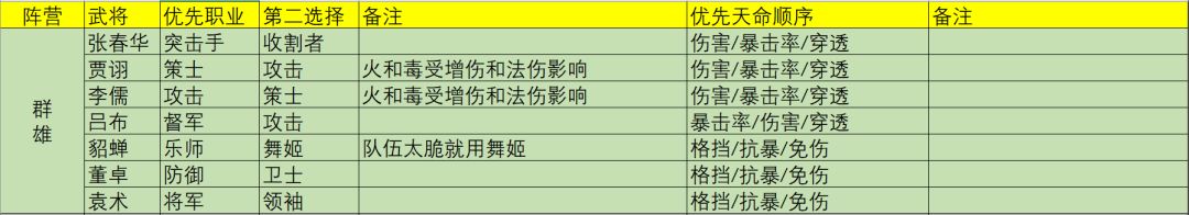 最后有各武将推荐表格,鉴于这个游戏的PVE和PVP要区别对待,所以在实战中还是要多考虑一下自己需要的东西,是要更多的伤害还是要更多的防御。其实主要就是围绕了几个方面,