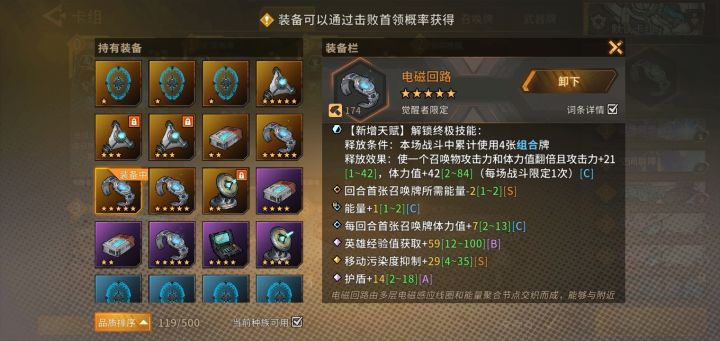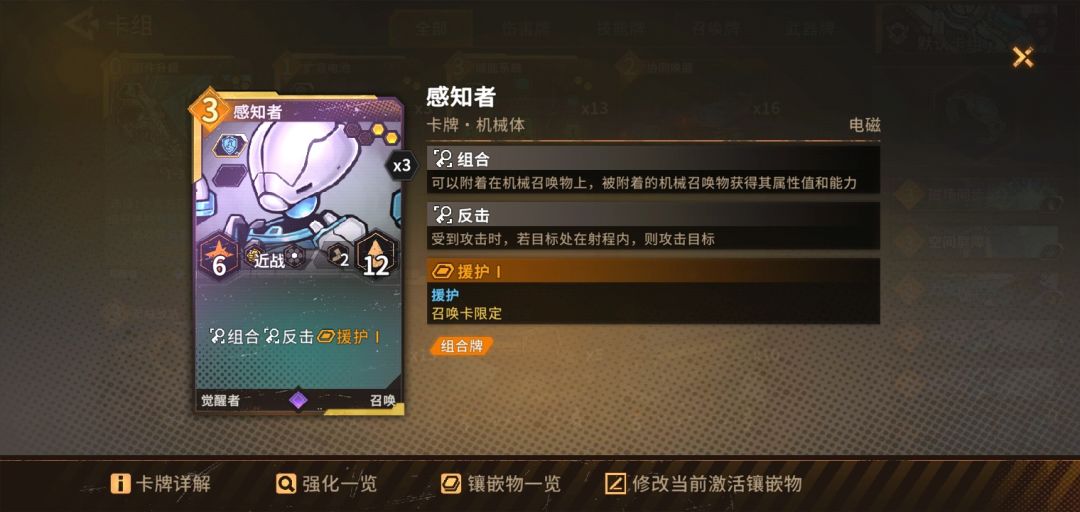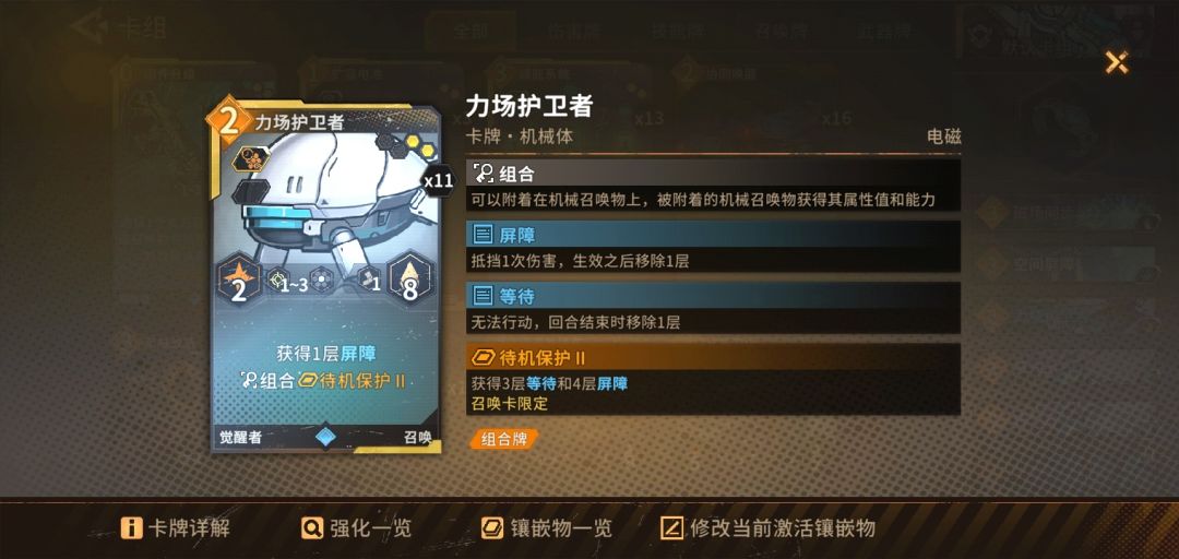 初始牌组和装备附上。思路就是觉醒者玩组合流召唤物快速叠加数值简单粗暴,玩家保命靠援护和召唤物叠加屏障,输出靠召唤物反击和叠屏障加攻击。1,初始卡组思路:高难度怪属性高靠固定给的五张卡打怪就是送死(那五张卡必删),必须要用自的选的五张卡打过第一个boss前面的哪些小怪。觉醒者保命靠援护,而援护的召唤物靠屏障保命。带力场卫士可以洗个待机保护,这样生存就够了。待机保护后不能主动攻击就反击,带感知者洗援护(也可以洗待机保护,力场卫士就洗援护)。出牌时候先下力场卫士因为是远程单位,然后再贴感知者到力场卫士上组合流就这点不好射程不能贴