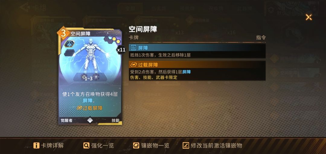 )。2,局内卡组思路:牌组最后留到15到20张牌,因为觉醒者没有过牌手段一回合就稳定抽两张卡后面能量明显溢出而且牌多了可能卡手不好启动形成体系!贴膜主要是为了加功能,攻击靠局内遗物那个变热器效果是回合结束后获得屏障数4倍的攻击,血量不重要因为靠屏障。最多20张牌3个回合内就能用完形成体系然后剩两张空间屏障一直叠