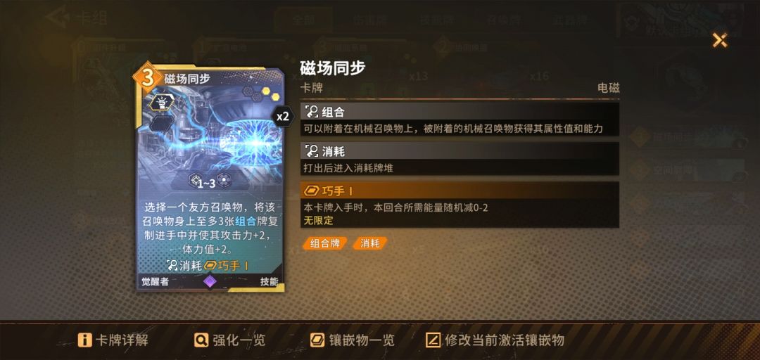 。然后带一张磁场同步洗减费提高上限。最后带一张空间屏障洗屏障(不是所有怪都能援护带屏障争取时间拖回合过牌带清等待的牌让召唤物启动),局内玩的时候可以多拿一张后面就剩这两张能重复利用的卡然后每回合都抽一直叠