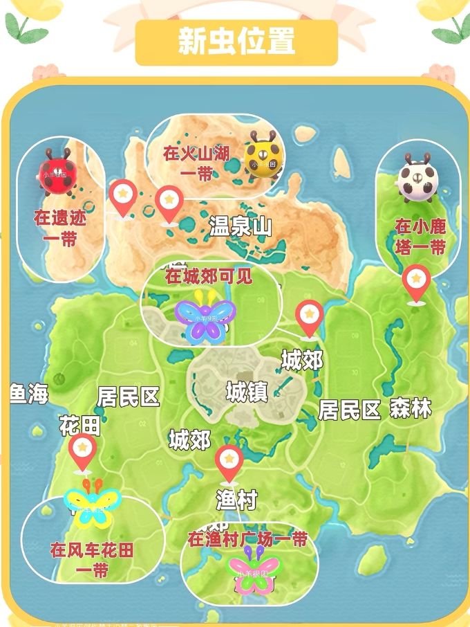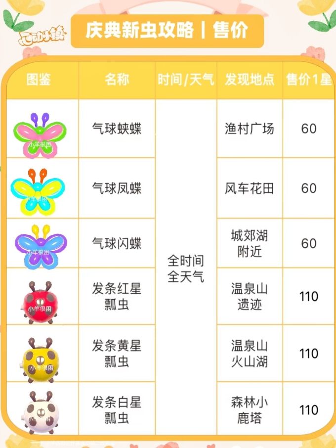心动小镇稚趣园6种新虫售价➕位置 新庆典新虫共6种: