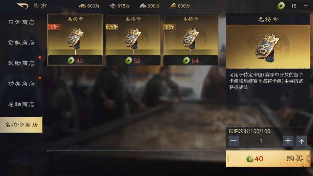 (3)充值获得的玉不要直接兑换金币,只用来买半价的名将令(每赛季重置),氪佬有多的钱除外。