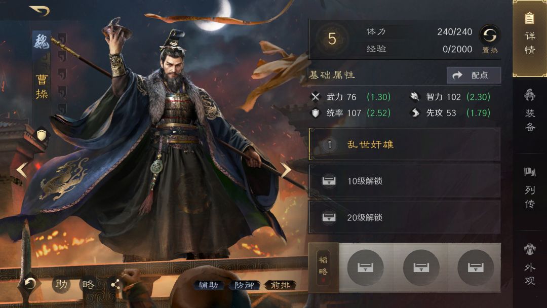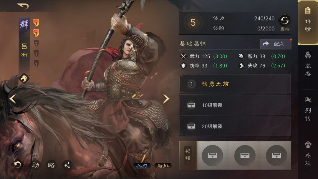 (7)吕布:又称牢布,与陈宫、乐进组成队伍,伤害十分爆炸,一回合打一万,三回合解决战斗,缺点是吕布比较演,发挥看概率,并且对战法要求较高。
