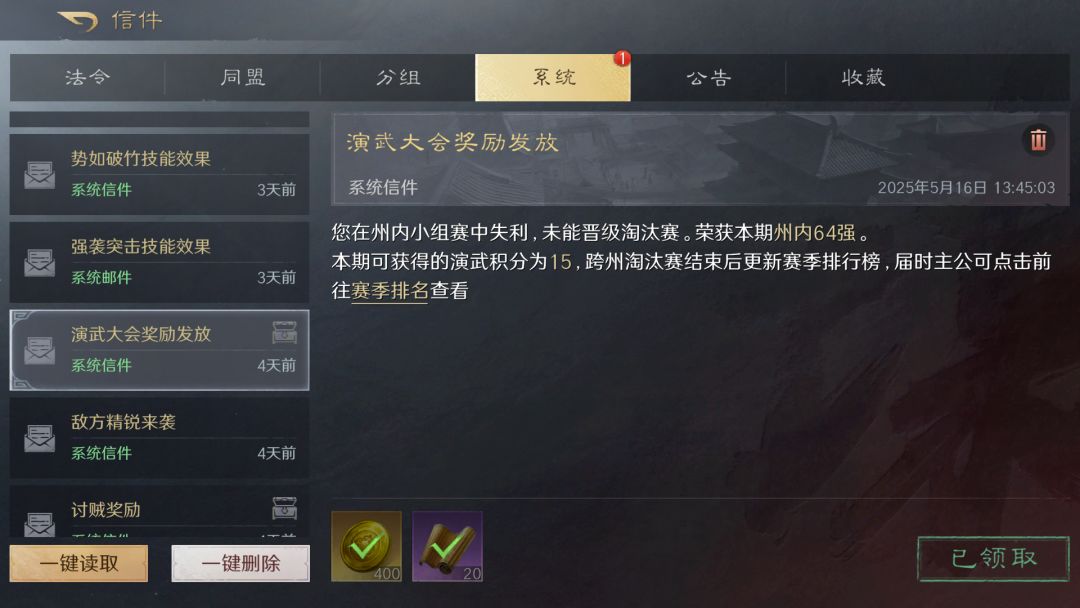 5.坚持参与演武,演武只要参与就给200金,去网上多找点攻略看看每次打入州内64强拿400金完全没问题,一周一次,稳定又省心。