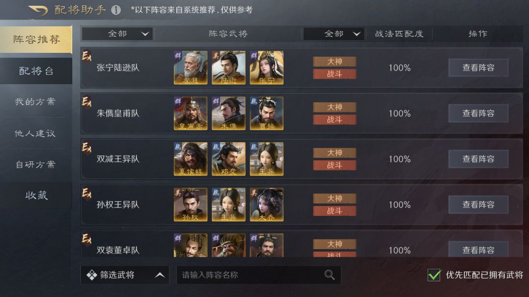(2)使用官方配将助手:点左下角聊天框,点配将频道,点配将台,点阵容推荐,系统会按照你拥有武将队伍的情况自动匹配当前你能组的队伍,预设的队伍强度基本在线,可以直接用。