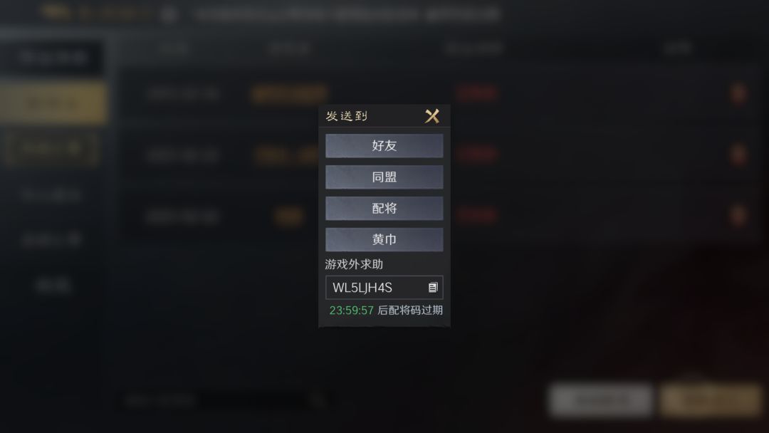 (3)请求盟友或主播协助配将:还是上面所说的配将模块,在配将台点击求助他人,点生成配将码,就会生成一个24h有效的配将码,这个编号发给其他人,其他人就可以进去看到你拥有的武将和战法,并且帮你完成配将,你这边在配将完成后可以点击一键应用直接替换当前阵容,非常方便。一般好点的盟都会有配将大师,也可以自己找主播帮忙配。