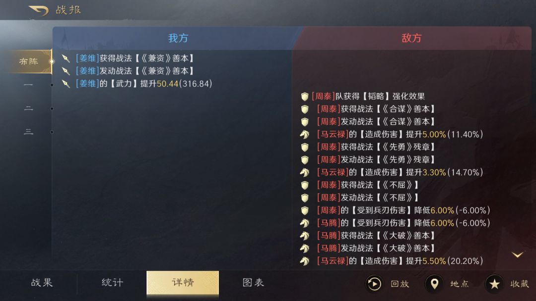 (4)直接抄对手的:部队派出去,同样的角色就是打不赢对面,或者对面出现了低红但是可以连杀的队伍,点战报进去可以直接看到对面的技能配置,再点详情就可以看到对方的韬略配置了,直接照抄即可。