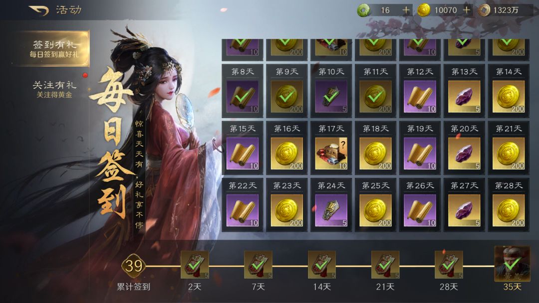 2.坚持签到,三谋的签到奖励很丰厚,一个赛季光签到就能领4000金+25抽+一个橙将,换算以下就是75抽资源,按8%出金率算,稳定给至少6个金卡。