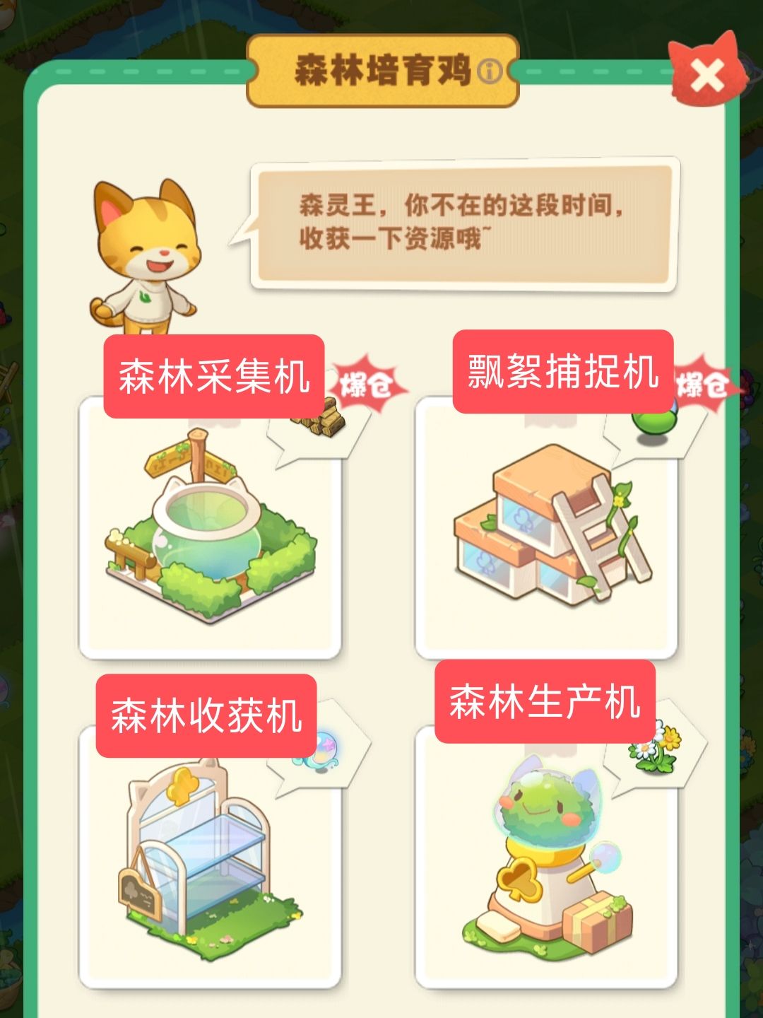 小森灵有四种协助采集收获的机器,查看路径如p7,分别是:森林采集机、森林收获机、森林生产机和飘絮捕捉机(p8)
