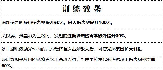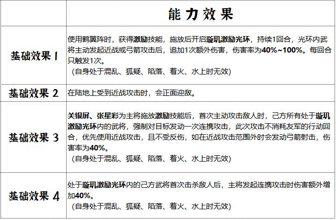 三国乱世的巾帼英豪,从不只限于后方运筹,璇玑营以铿锵战意化作燎原之火,提振士气。携带璇玑兵符的武将使用鹤翼阵时,将获得特殊技能 —— 激励(消耗35体力,不消耗行动回合):使用后开启特殊的 璇玑激励光环。