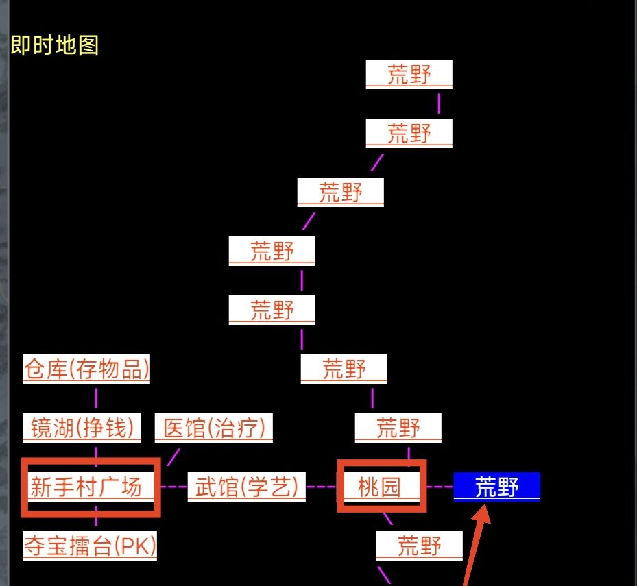 新手广场以东行至桃园,再东一步至荒野。