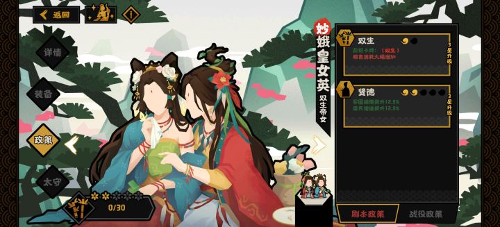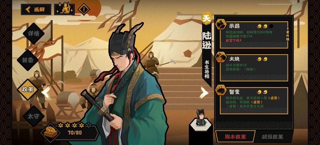 剧本中有几个政策可以减少暴力值,在开始的几个城,可以先攻下城,然后直接点政策。剧本一开始打董卓的时候,他会不停提供援军卡还是挺好打的。陆逊的拜访减敌方军规该用用,也不指着开会盟。还有到后期难免别人开会盟打。陆逊三层虚势,还有剧本政策提供的高垒兵法,叠加高达70%的格挡,稳的一批,谁敢范我大汉天威。