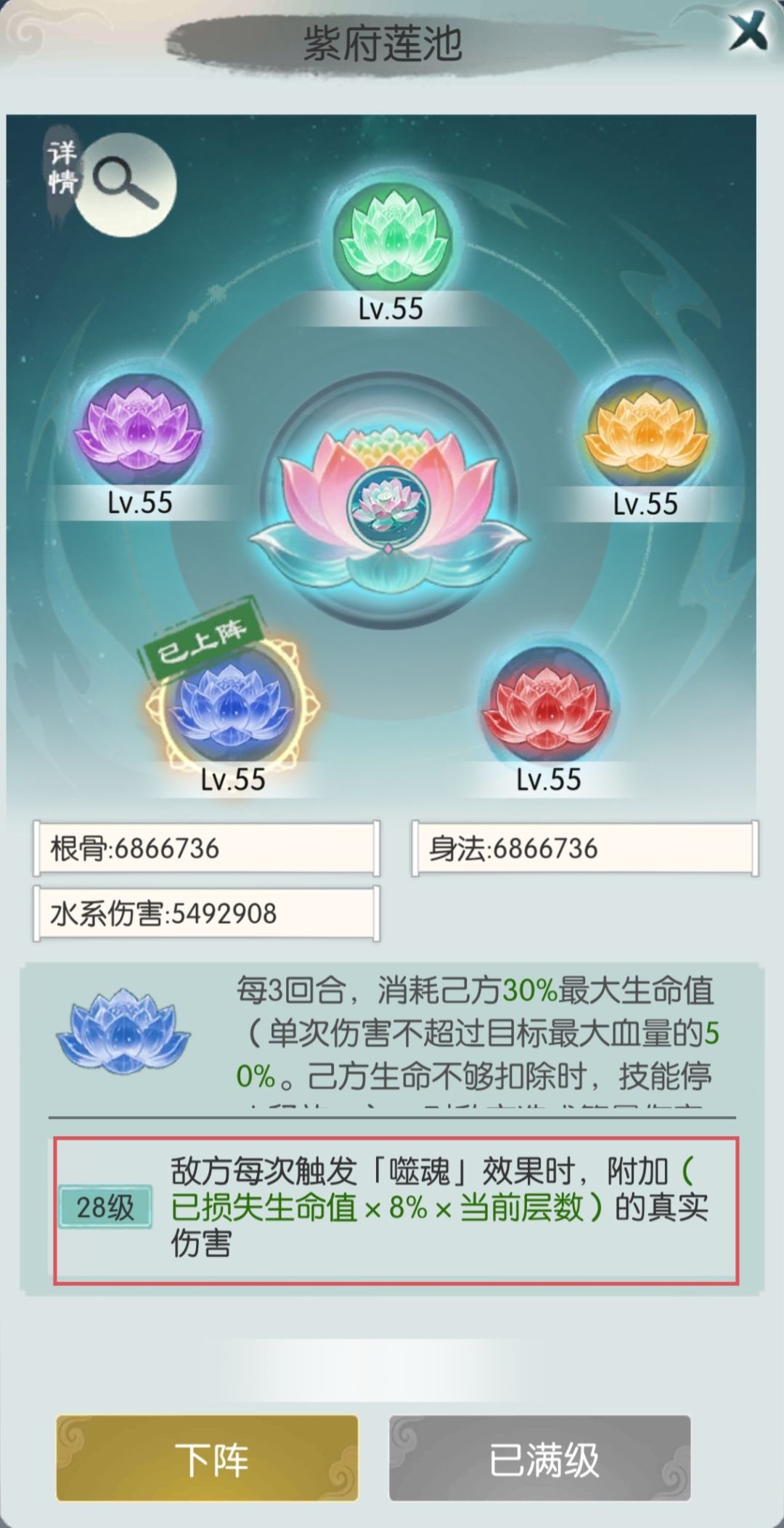 这里简单说一下副本效果(均以不卡血为前提),土系,木系,金系偏生存向,伤害提供不多,火系伤害叠加缓慢,较为温和,水系莲花伤害最强,因为28级的效果类似于低血量“斩杀”。