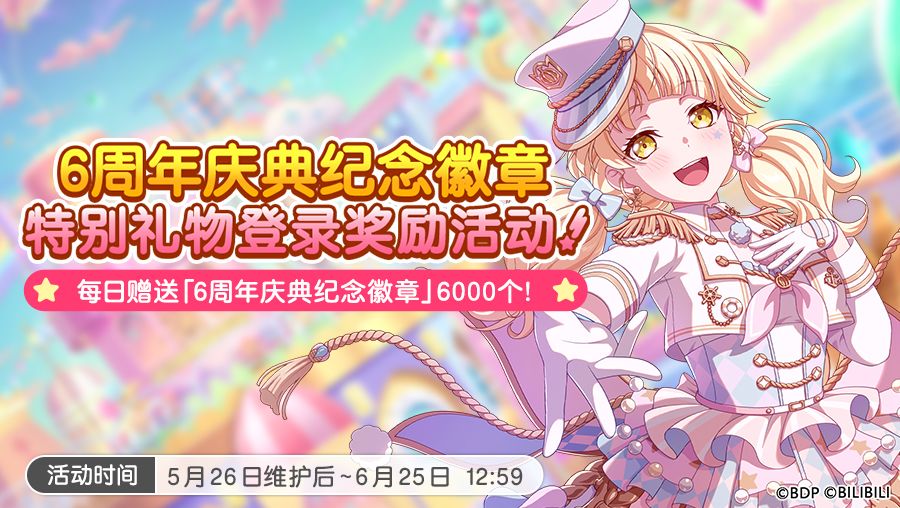 5月26日维护后~6月25日12:59期间每日登录游戏即可获得对应日期的「6周年纪念徽章」。