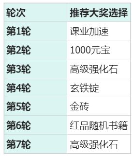 因为课业加速来源比建筑加速要少,元宝也可以通过日常慢慢累积,所以前几轮大奖推荐大家按以下方案选择: