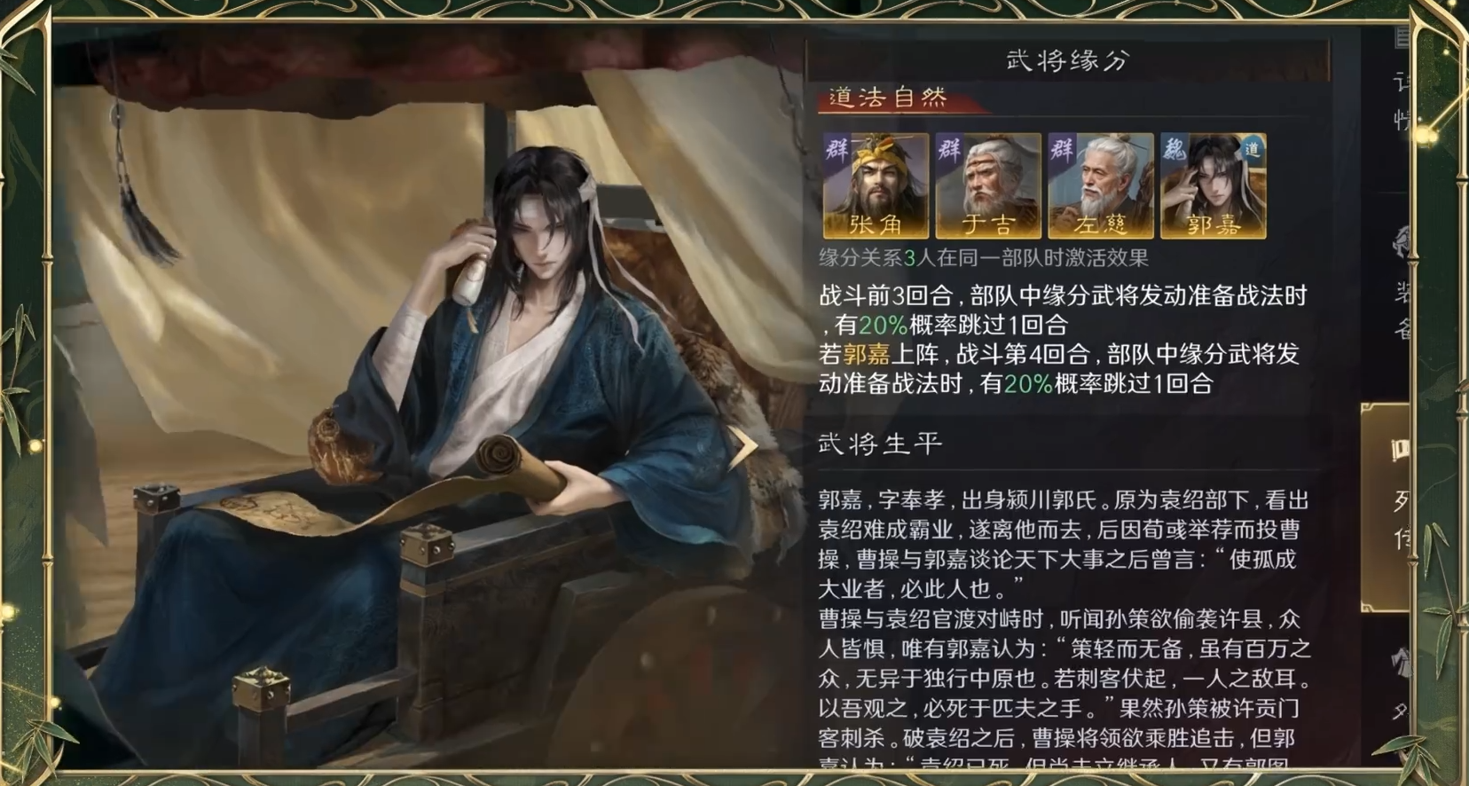 比如对郭嘉施加“道法自然”缘分的信物。与缘分武将配队时,不仅可以激活原本的缘分效果,还会产生额外的效果!