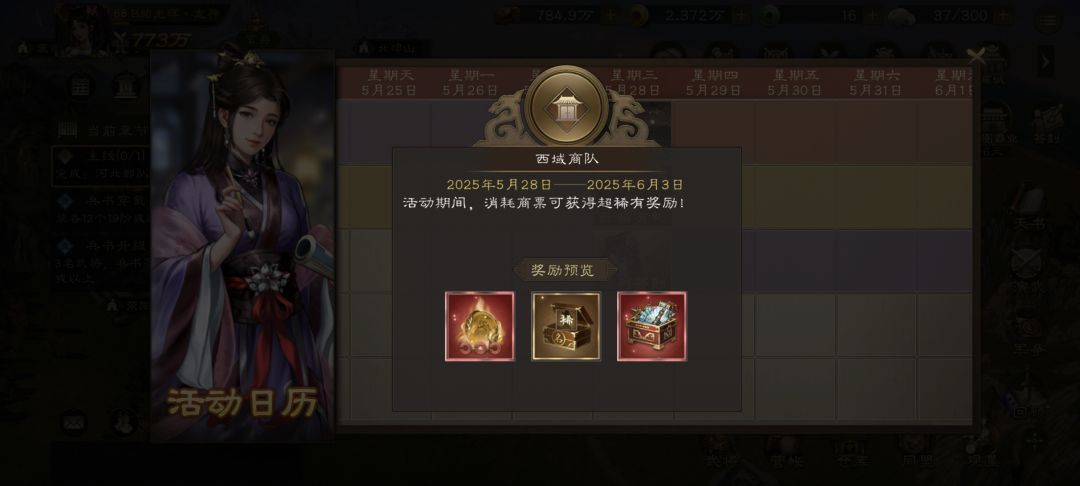 西域商队:花金珠的核心活动,最黑保底2万7金珠或者90商票,一定要看清楚了再抽,千万别抽到一半拿不到大奖但是资源没了,非常亏,第四轮开始会有自选神兵,如果资源不够可以存,尽量拿到自选神兵。