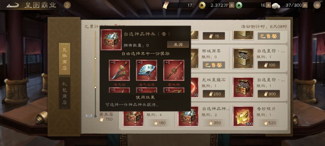 皇图霸业:如果有耐心,就存3至4次(历时一个半月),可以白嫖一个自选神兵,如果没有耐心,那就每期花光,只换普通蓝色抽和包子,有金珠兑换皇图券要买满。