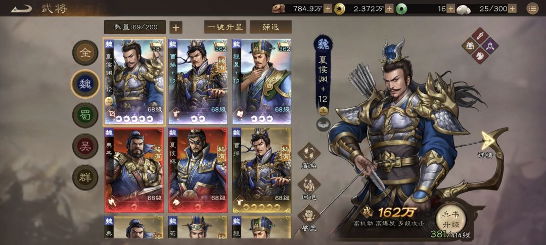 说回魏国,首先核心辅助曹操,基本上是白送的12星(可以把辅助能力拉满),如果大池子没有抽出来,可以用幸运观星选一个,拉到12星停止。主c夏侯渊,新手池两个都选他,优先拉满,然后法师c可以选择程昱,程昱的强度即使是在稀有中也不差,身上有buff技能就会获得增强,然后我们幸运观星活动可以选择夏侯惇,夏侯惇就是魏国最强的pve打桩机,氪佬的极限也就是满星满神兵,而零氪满星有神兵之后,用魏国来打pve伤害并不会比氪佬弱多少。