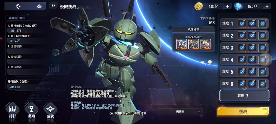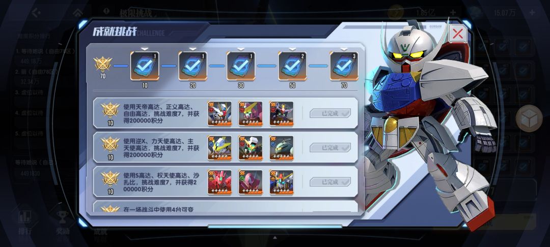 至于成就,我都是暗自由和逆A带着要求的机体完成的,就按要求来,我每次都是200万左右,要达成20万积分估计1.5亿左右战力应该就差不多,我感觉主要输出是来自这俩机子的。