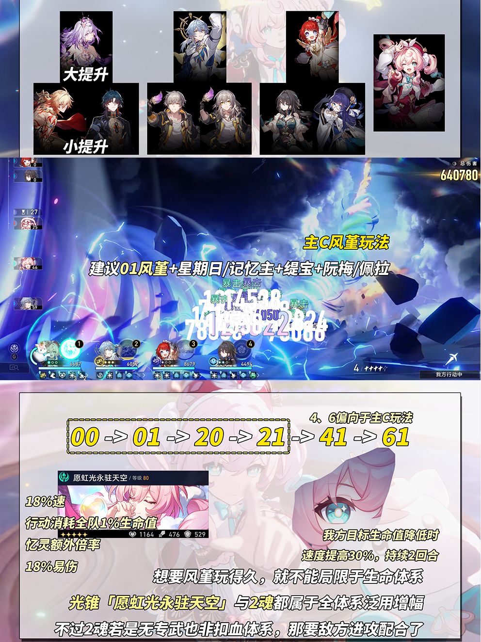 【主C风堇参考】配队需考虑拉条、暴击伤害、真实伤害、易伤、穿透。例如以下角色:星期日、缇宝、记忆主、阮梅、佩拉