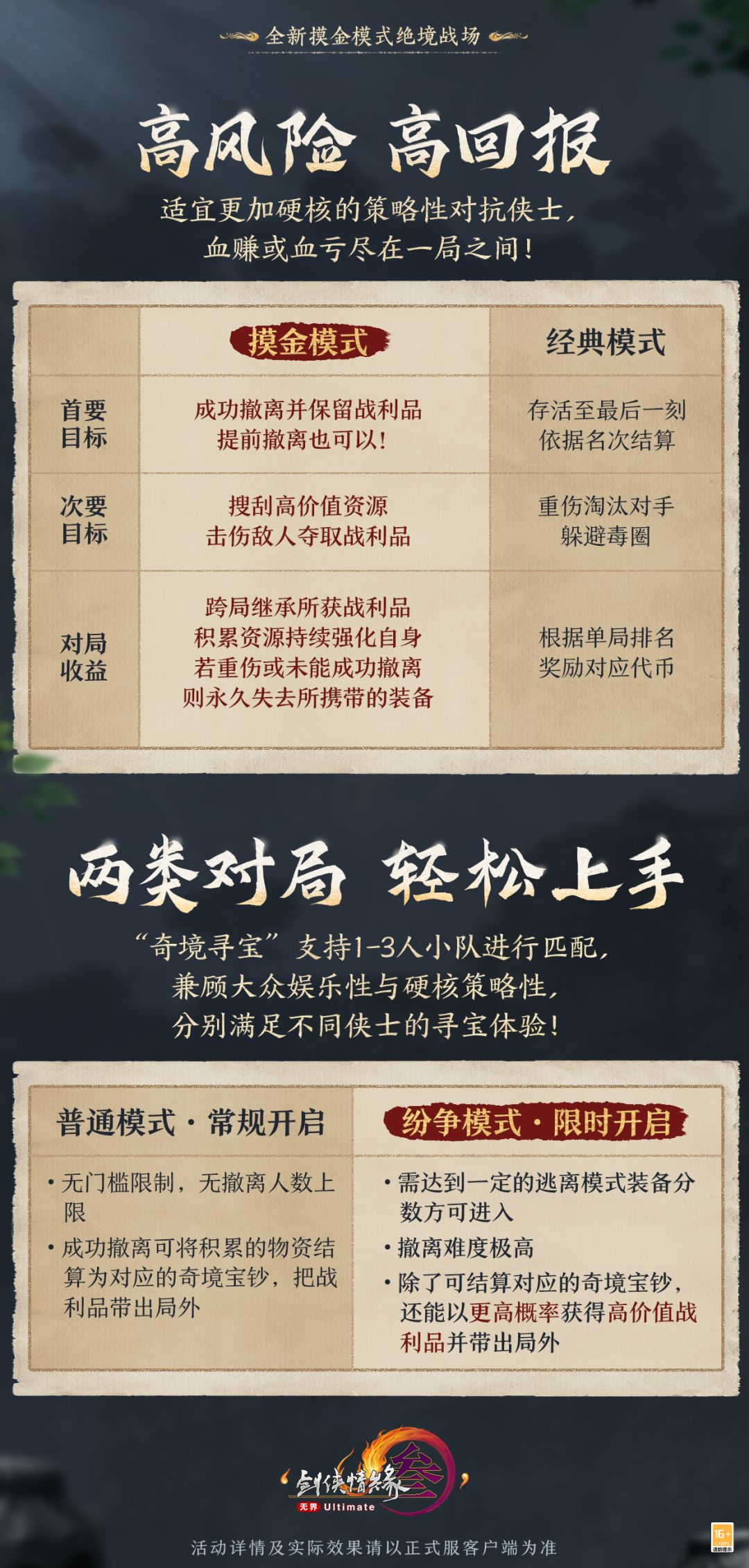 其中,“奇境寻宝”将分为2大类对局模式,让未接触过摸金模式的侠士可以轻松上手,也让喜爱摸金玩法的侠士能体验到较为硬核的策略性对抗!