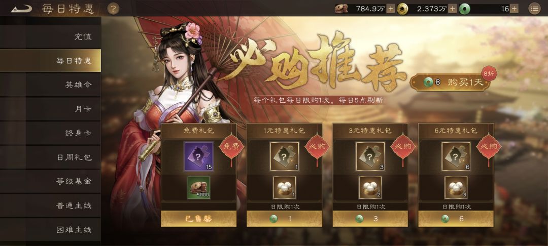 每日特惠也是唯一稳定能氪体力的地方,如果想跟上节奏就可以每天买,小氪可以买到65级,其他可以拉满。