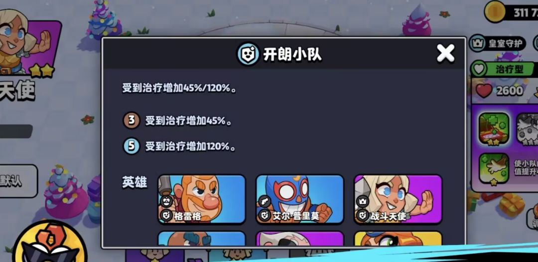 开朗小队的效果则比较简单,凑齐3位角色后,受到治疗量将增加到45%;凑齐5位角色后,治疗量将增加至120%。这个效果搭配二星天使的开箱治疗会产生相当恐怖的治疗量!
