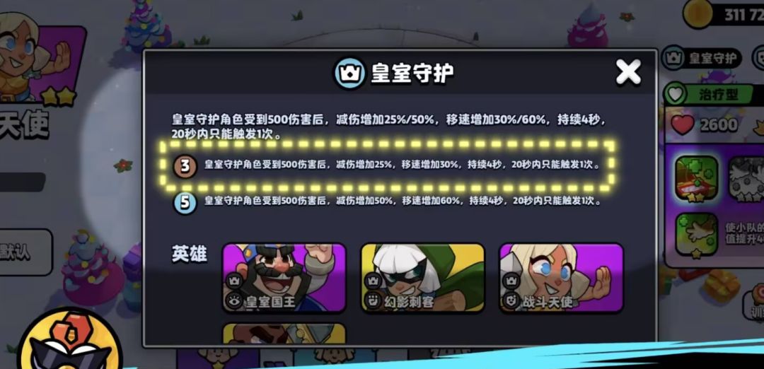 皇室守护的羁绊效果是凑齐3位角色后,当羁绊角色受到500点伤害后获得25%的减伤,同时移速增加30%,持续4秒钟,这个效果每20秒只能触发一次;当凑齐5位角色以后减伤将增加到50%,移速也将增加到60%。